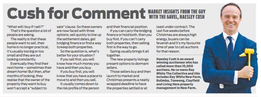 If you sell first, you will know how much money you have and then you buy. If you buy first, you will know that you have a place to move to and then you sell. It usually comes down to the risk profile of the person and their financial position. If you can carry the bridging finance or hold both, then you buy first. If you can’t carry both properties, then selling first is the way to go. Spring usually brings it all together. The new property listings present options to dormant sellers. Those sellers buy and then launch to market and Christmas presents a neatly wrapped deadline to have the properties settled or at least under contract.